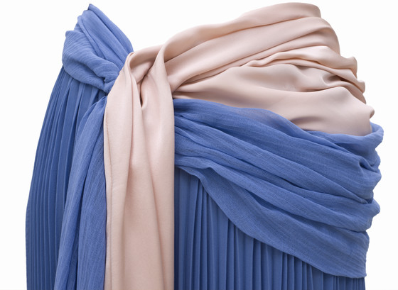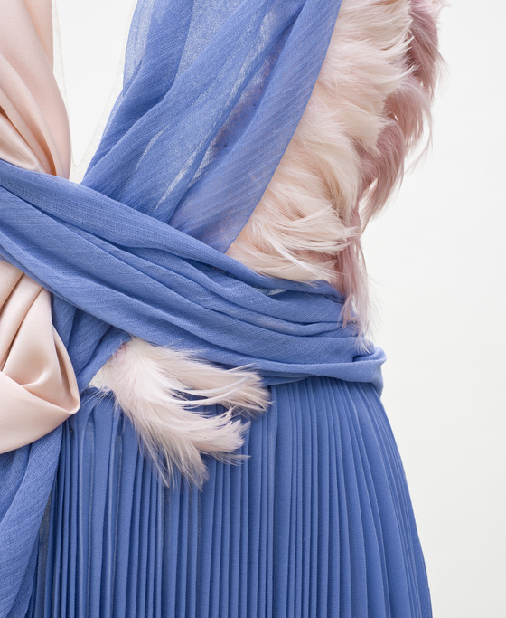 Silk plain weave (crepe) with silk satin, cotton open plain weave, crystals and feathers