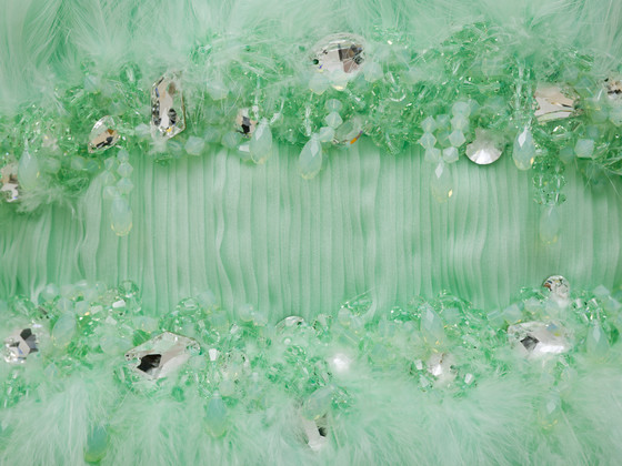 Silk chiffon with feathers, crystals, and silk flowers with pearl beads