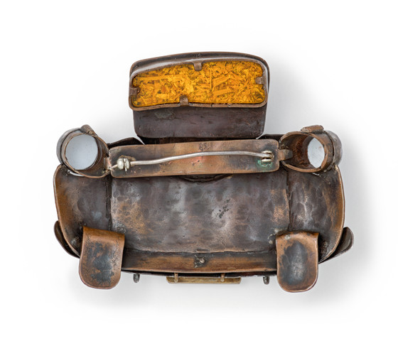 Copper, silver, enamel, plastic eyes, photographs, polymethyl methacrylate, sawdust