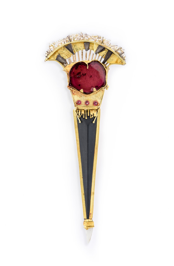 The following objects comprise Lois and Bob Boardman’s extraordinary gift of international contemporary jewelry to LACMA. The jewelers represented have followed the lead of earlier craftspeople, who defied conventions by creating innovative designs and using non-precious materials to make works prized for their artistic, rather than monetary, value. They continue to push the boundaries of their field, making jewelry that is distinguished by its personal and political messages, its unlikely media, and its potential to shock and delight.