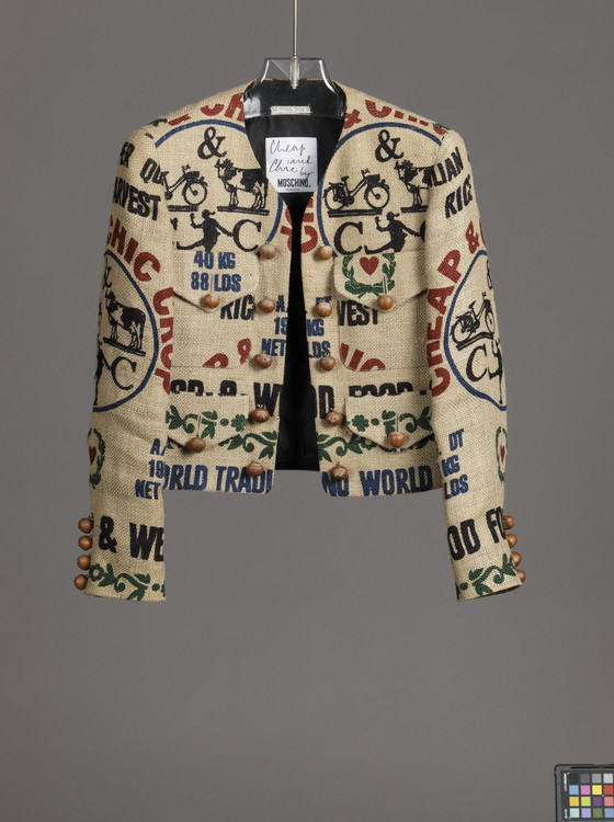 Jute plain weave (burlap), screenprinted; with hazelnut buttons