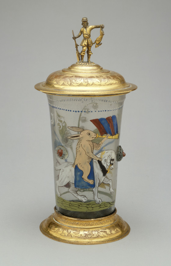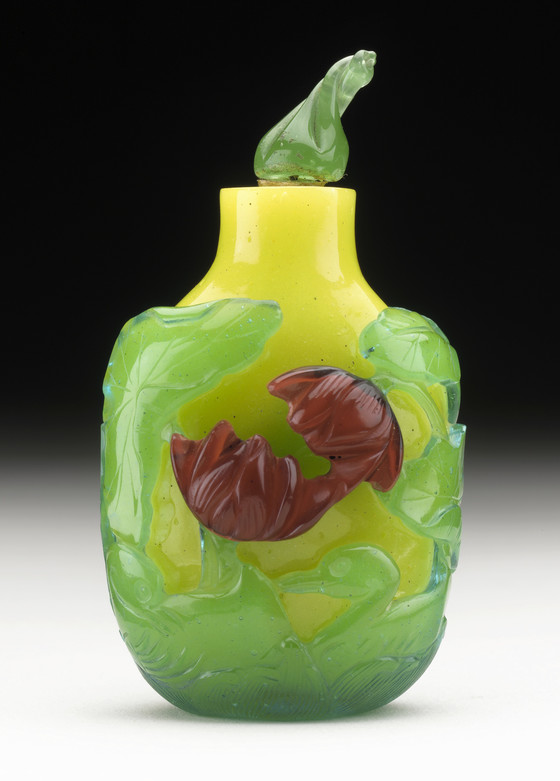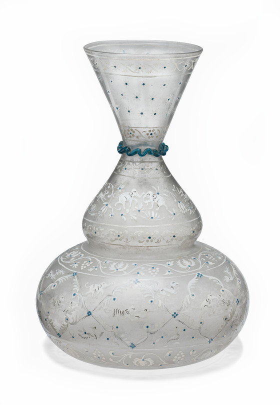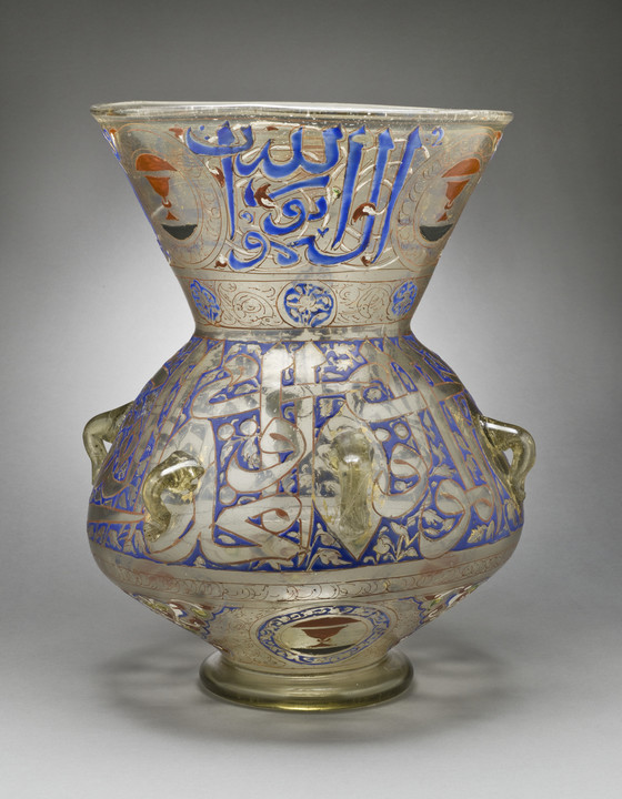 Through the centuries, improved manufacturing methods and architectural innovations meant that its use became more sophisticated. For example, the Romans used tiny bits of colored glass to make brightly colored mosaics that resemble murals. Later, it was used to make windows, including the brilliantly colored stained glass windows of Gothic cathedrals. The selection presented here, from the museum’s permanent collection, ranges from utilitarian bottles used in the Ancient Middle East, all the way to contemporary times, when glass is used to make purely aesthetic works of art sometimes known as “art glass.”