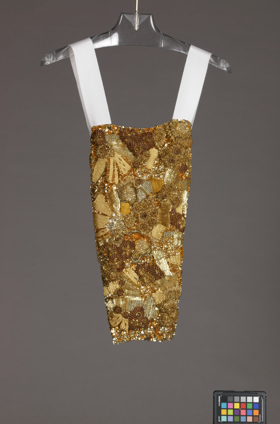 Silk plain weave (crepe), with metallic ribbon, metallic thread, glass bead, and sequin embroidery