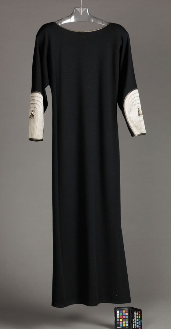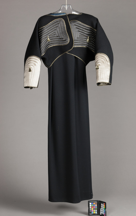 Dress: Wool knit (jersey), metallic trim; Jacket: Wool plain weave, fulled (melton), silk satin, quilted, metallic-thread trim, metallic tassels