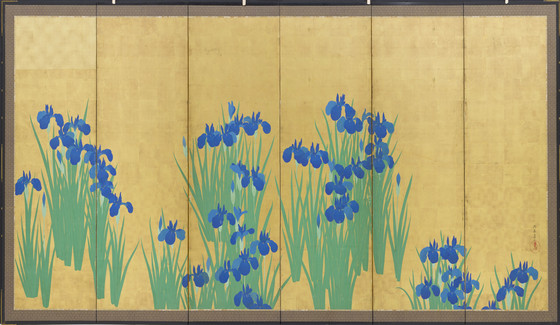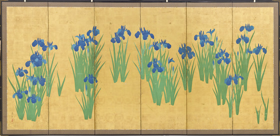 Pair of six-panel screens; mineral pigment color and gold leaf on paper