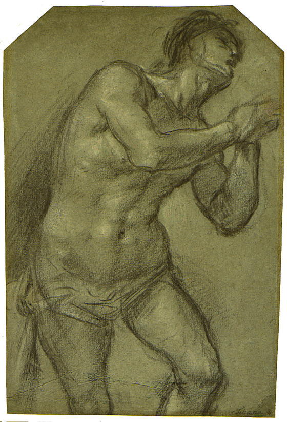Like many Venetian Renaissance drawings of dynamic single figures rendered loosely in black chalk, this sheet was once attributed to Titian, the greatest and most influential artist in sixteenth-century Venice; the great connoisseur Philip Pouncey, however, suggested as the author. The sheet illustrates the influence on Bordone of Titian’s manner of draftsmanship, particularly the painterly and atmospheric application of chalk on colored paper. The drama, dynamism, and emotional character implied by the pose of the figure exemplifies the influence on Bordone of the art of Giovanni Antonio da Pordenone. The figure’s torso and arms recall (in reverse) those of Christ in Bordone’s painting The Baptism of Christ of about 1535 in the National Gallery of Art, Washington, D.C.,1 while the legs resemble (also in reverse) the stance of Saint Christopher in the Sacra Conversazione of about 1525–26 in the Accademia Tadini, Lovere.2 Alessandro Ballarin (conversation with the author) does not support the attribution to Bordone and suggests it dates from later in the sixteenth century.