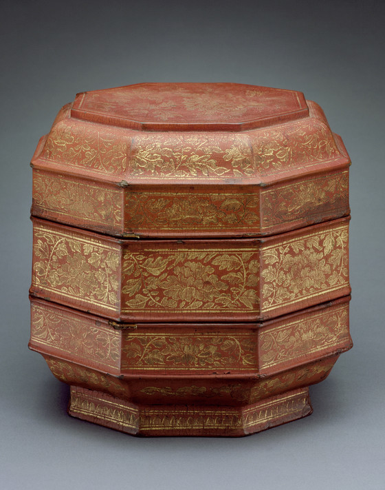 Octagonal Three-Tiered Cosmetic Box (Bajiao Sanceng Lian) with Peony Scrolls