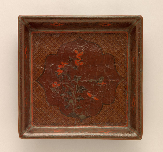 Red lacquer on wood core with incised and painted decoration