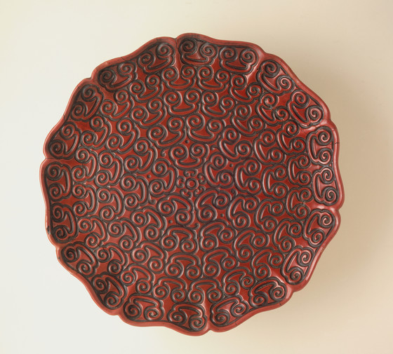 Carved red and brown lacquer on wood core (tixi)