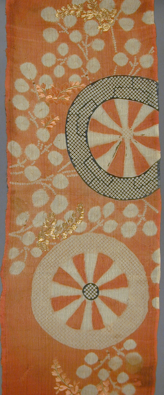 Silk plain weave (crepe; chirimen), tie-resist-dyed (kanoko shibori), and stitch-reist-dyed (nuishime shibori), with silk- and gilt-paper-wrapped-silk-thread embroidery