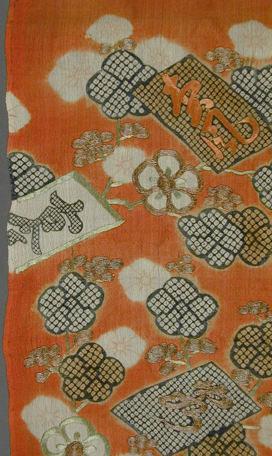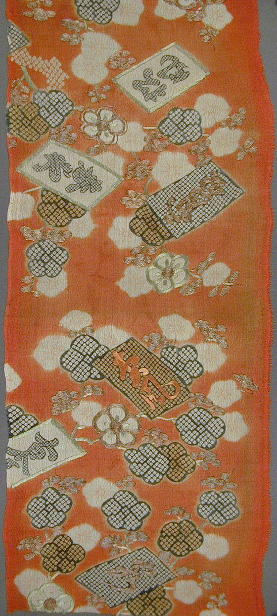 Silk plain weave (crepe; chirimen), stitch-resist (nuishime shibori), stenciled imitation tie-dyed (kata kanoko), and silk and gilt paper-wrapped silk embroidery