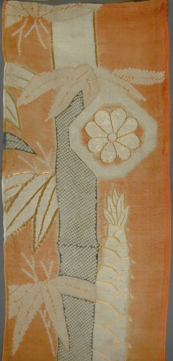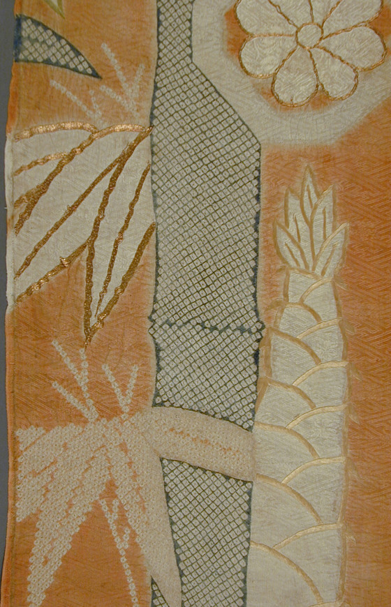 Silk figured satin (rinzu), tie-dyed (kanoko and nuishime shibori) and stenciled imitation tie-dyed (kata kanoko), with silk and gilt-paper-wrapped-silk-thread embroidery, and appliqué
