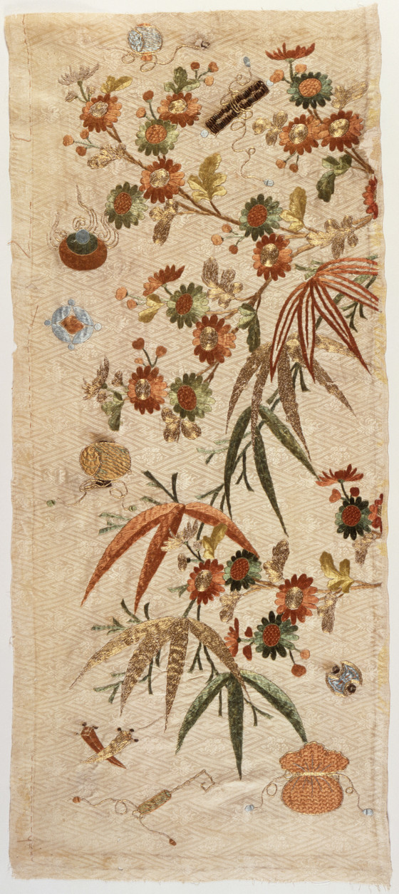 Kosode (Kimono) Fragment with Bamboo, Chrysanthemum, and Emblems of Good Fortune (Takaramono)
