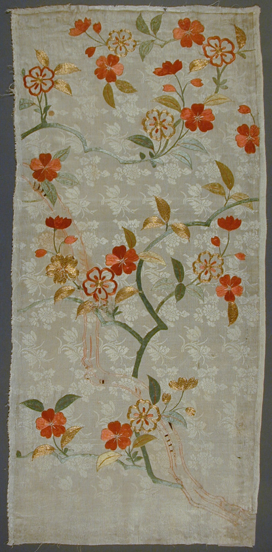 Silk figured satin (rinzu) with silk and gilt paper wrapped silk embroidery