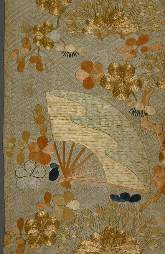 Kosode (Kimono) Fragment with Plum Blossoms, Pine, and Fan