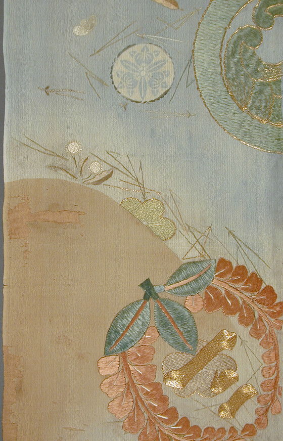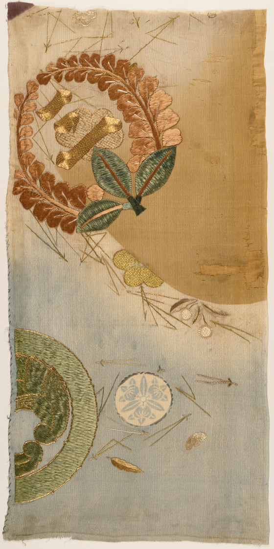 Silk plain weave (crepe; chirimen), brush-dyed (hikizome), silk, gilt paper wrapped silk thread, and gillt paper embroidery, paste-resist dyed (noribosen)