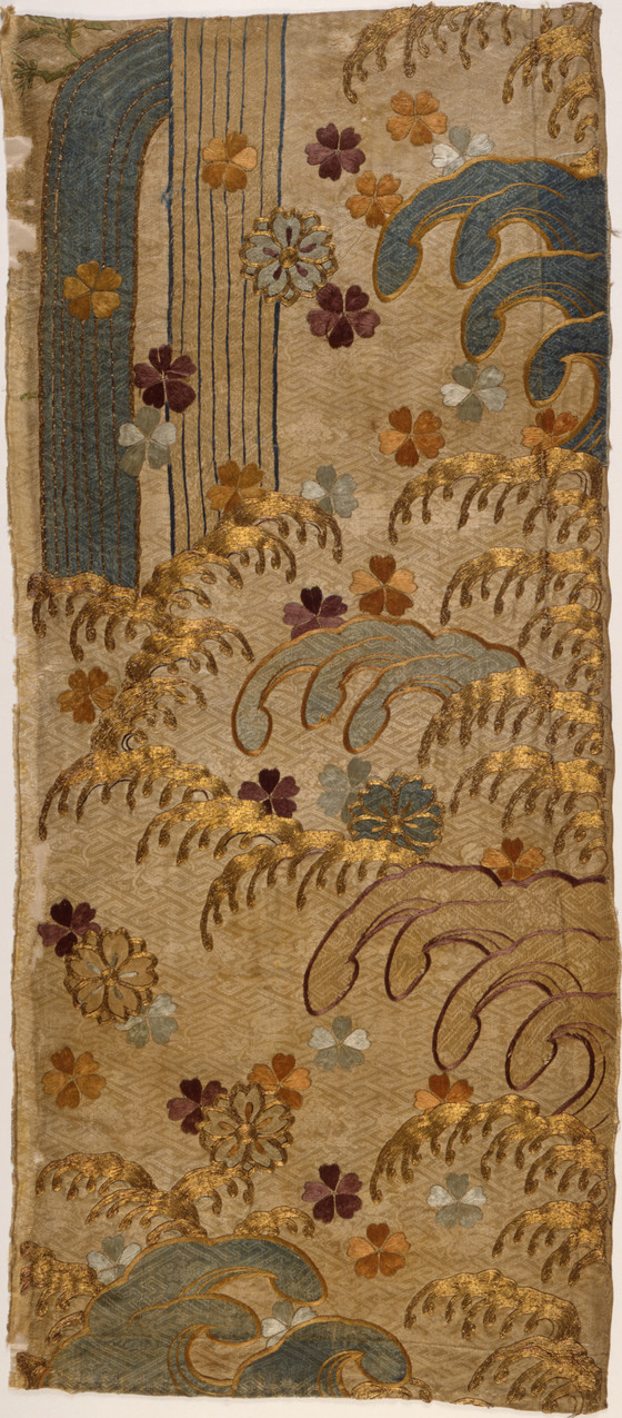 Kosode (Kimono) Fragment with Waterfall, Waves, and Cherry Blossoms