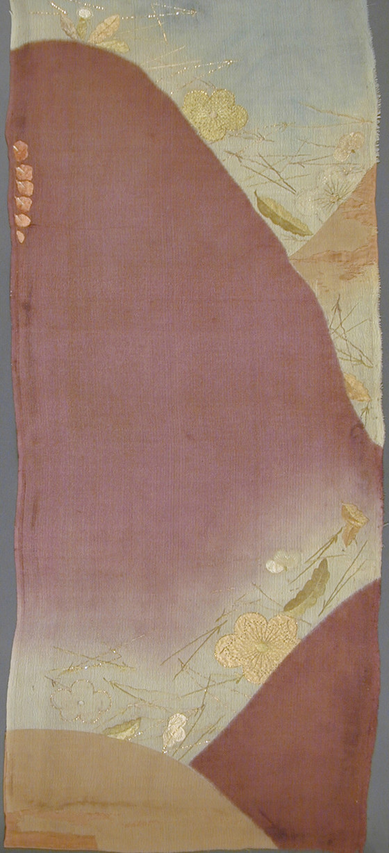 Kosode (Kimono) Fragment with Mountain Forms, Pine Needles, Plum Blossoms, Dandelions, and Wisteria Blossoms