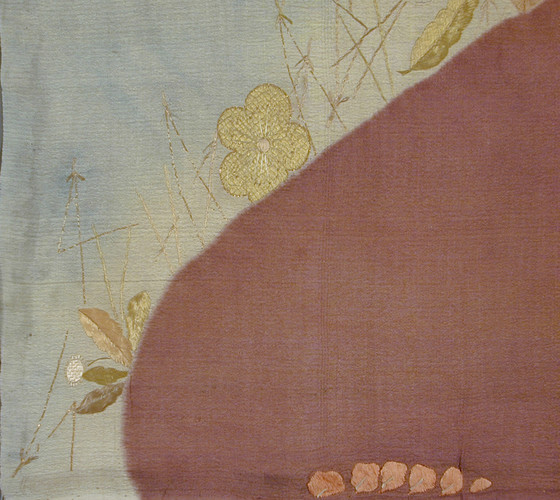 Silk plain weave (crepe; chirimen), stitch-resist-dyed (nuishime shibori) and brush-dyed (hikizome), with silk- and gilt-paper-thread embroidery