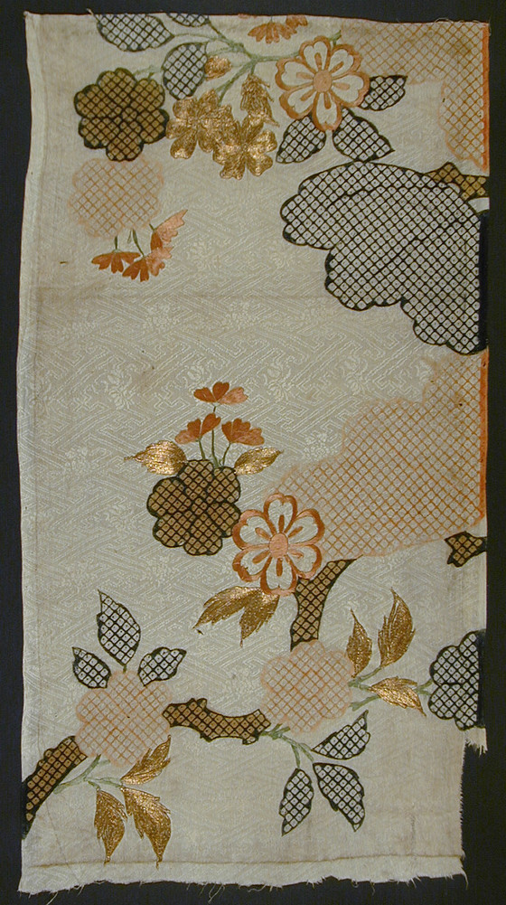 Silk figured satin (rinzu), stenciled imitation tie-dyed (kata kanoko), silk and gilt-paper-wrapped-silk thread embroidery