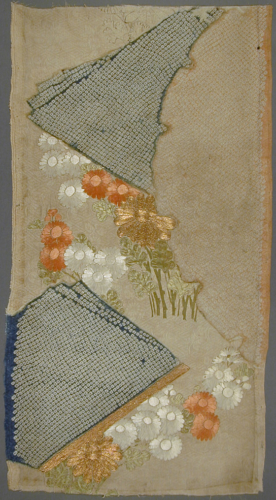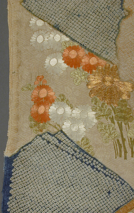 Silk figured satin (rinzu), Tie-dyed (kanoko shibori), silk and gilt paper wrapped thread embroidery