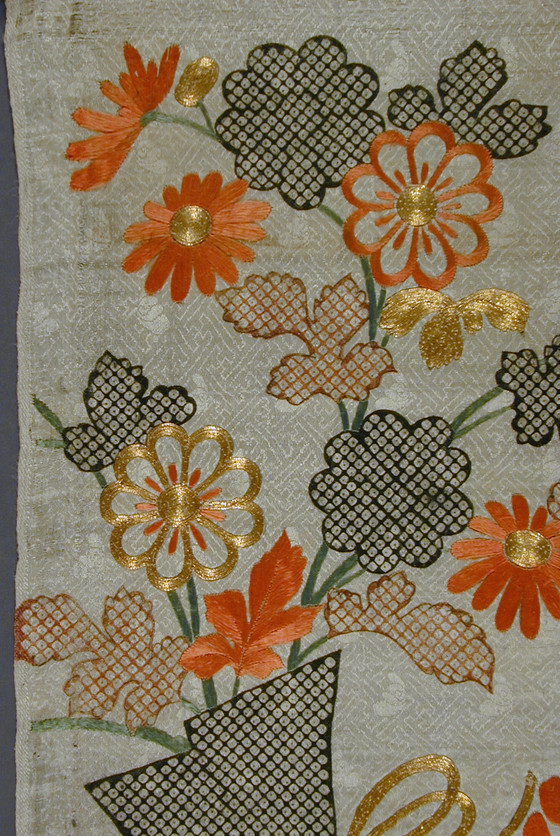 Silk figured satin (rinzu), stenciled imitation tie-dye (kata-kanoko shibori) with silk and gilt paper wrapped silk thread embroidery