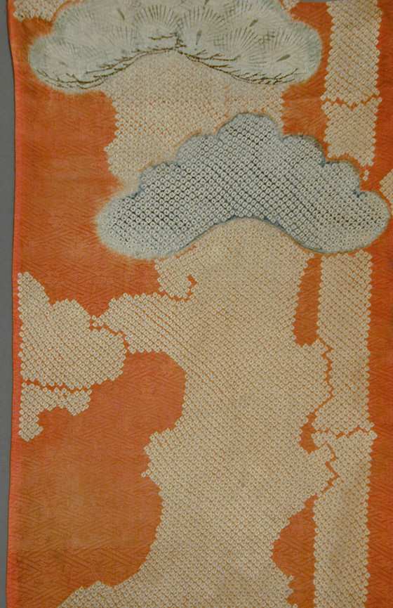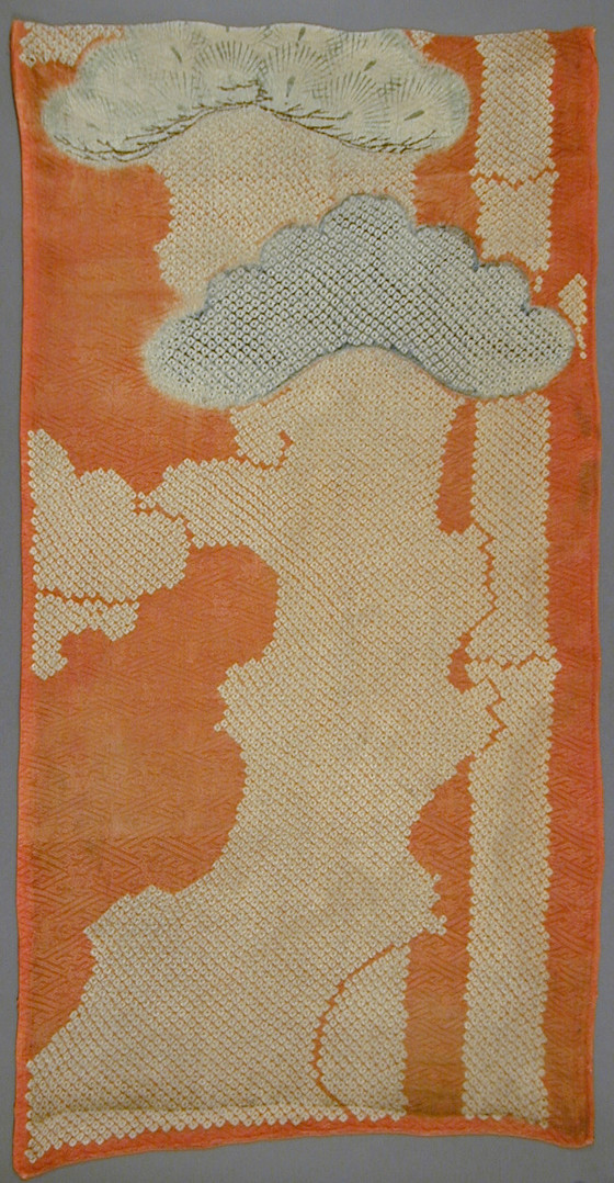 Silk figured satin (rinzu), tie-resist dyed (kanoko shibori), hand-painted