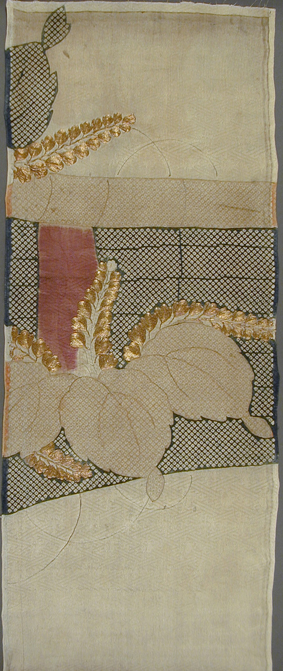 Silk figured satin (rinzu), stenciled imitation tie-dye (kata kanoko shibori), stitch resist (muishime shibori) with gilt paper wrapped silk thread embroidery