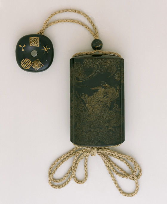 [inrō] Chinkinbori lacquer on black ground; [ojime] mixed metals; [netsuke] wood