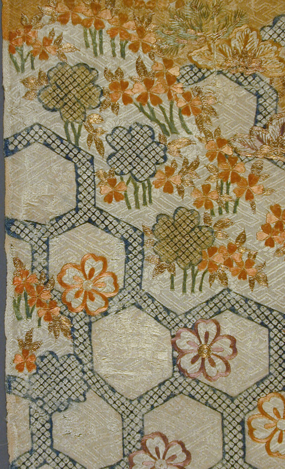 Silk figured satin (rinzu), stenciled imitation tie-dyed (kata kanoko shibori), silk-and gilt-paper-wrapped silk embroidery