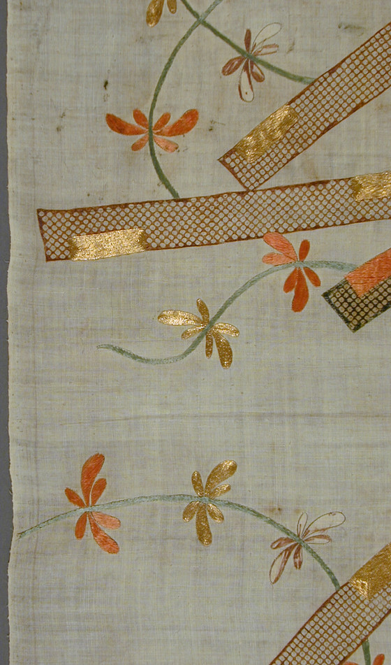 Ramie (choma) plain weavem stenciled imitation tie-dyed (kata kanoko shibori), with silk- and gilt-paper-wrapped-silk-thread embroidery