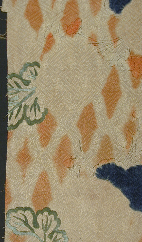 silk figured satin (rinzu), tie-resist dyed (shibori), with silk and gilt-paper-wrapped-silk thread embroidery
