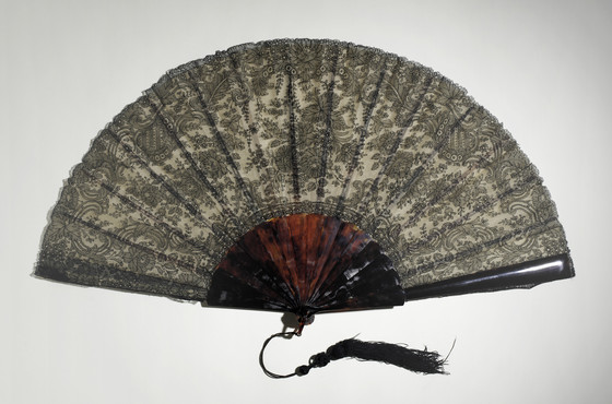 a) fan: Lace and silk leaf, imitation tortoise shell sticks and loop