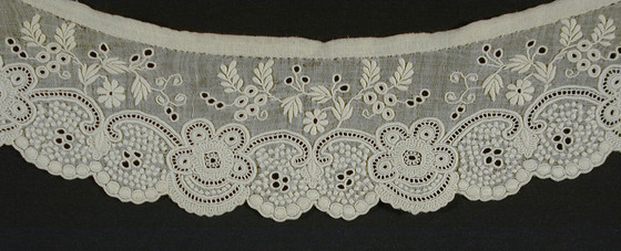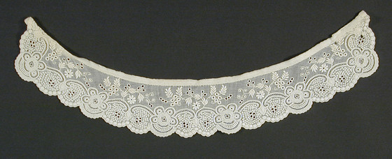 United States; Collar. C.1850; fine white cotton in a four-petaled motif centered with lace stitch, seed stitch; 12 1/2 x 2 in.