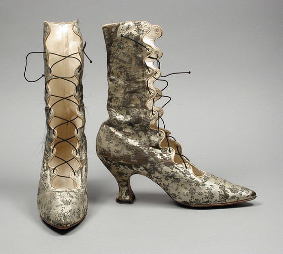 Brocaded silk satin, leather