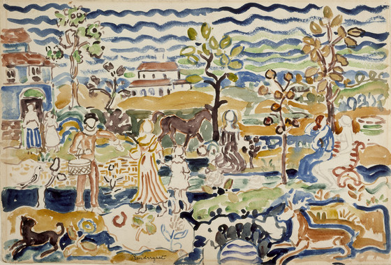 Decorative Composition is characteristic of Prendergast’s theme of promenades but atypical stylistically. It was painted during an experimental period in the artist’s career. While earlier watercolors reveal Prendergast’s increasing use of individualized brush strokes as abstract, notational elements, he usually painted with short strokes rather than long lines. In this composition the wavy lines in the sky are especially unusual, as is the formation of white lines by leaving the paper exposed. The effect is fauvist, like the art of Henri Matisse (1869-1954), and recalls the arabesque linearity of the decorative, incised and painted panels his brother Charles began creating around the same time.