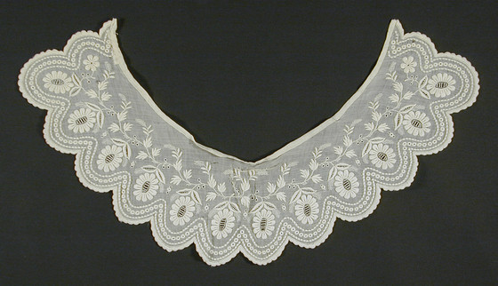 Linen plain weave with cotton cutwork and drawn thread work embroidery