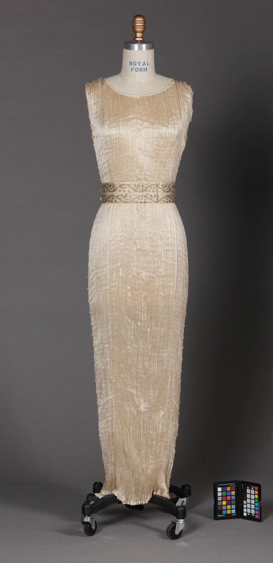 Dress: silk plain weave, pleated, with silk cord and glass beads; Belt: silk plain weave with metallic-pigment stenciling