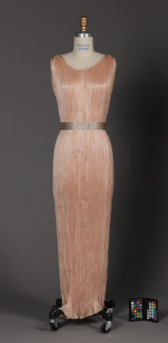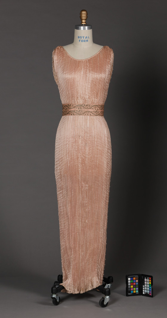Dress: silk plain weave, pleated, with silk cord and glass beads; Belts: silk plain weave with metallic-pigment stenciling