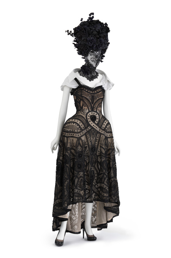 Dress: Cotton net with cotton lace, glass beads, plastic sequins, and silk satin
