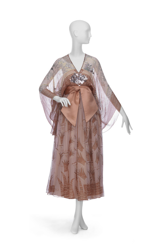 Dress: Silk plain weave (crepe), printed, with plastic sequins