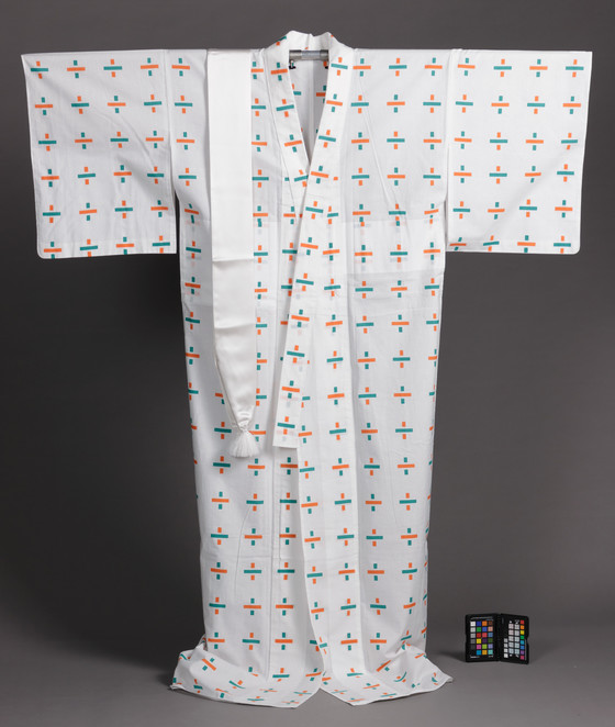 Woman's summer kimono (yukata): Cotton plain weave (sarashi), stenciled paste-resist dyed (chūsen); Sash (obi): Silk satin