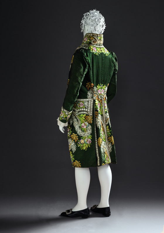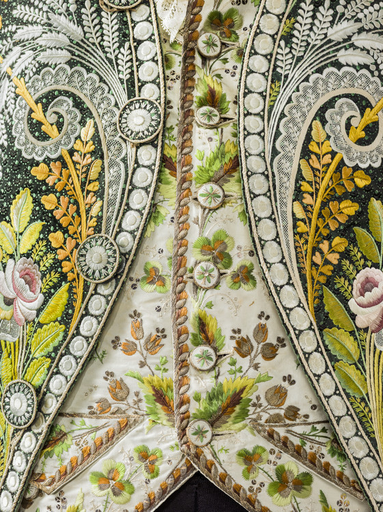 Silk figured plain weave with silk warp-float and self-weft patterning with silk embroidery