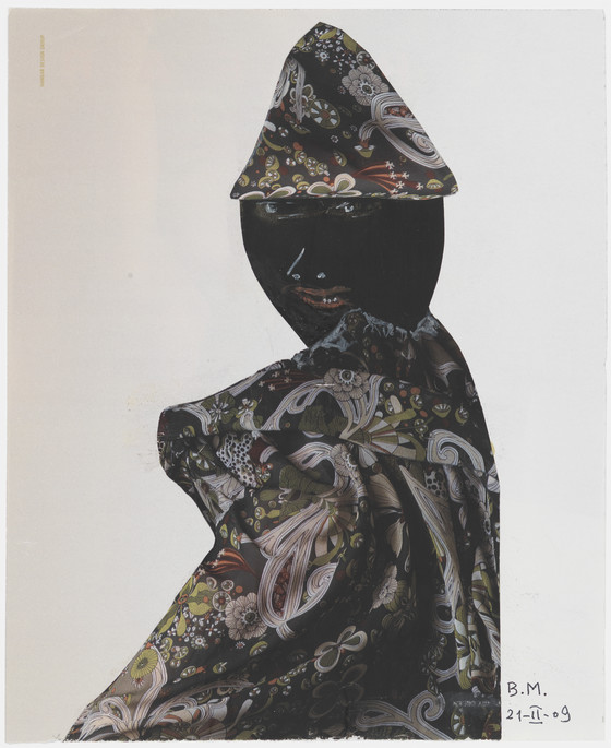 This collage functions as a portrait of a figure whose hand-drawn face meets the viewer’s gaze with a sly smile. The triangular hat, matching billowy top, and dark visage resonate with two archetypal figures, one from an Italian context and the other from an Iranian context. In the masked theatre tradition commedia dell’arte of Renaissance Italy, the harlequin is a trickster servant often shown in diamond-patterned costume and a mask of black or brown leather, an unspoken reference to his racial identity or rural peasant background. Mohassess’s figure from 2009, who trades in a paisley pattern for the more traditional checkered design, serves to reflect on the history of Western art in its reference to a trope that remained popular long after 16th-century Italy in the pantomime traditions of Victorian England and the work of modernist painters like Picasso and Cezanne. However, the figure also recalls Hajji Firuz, a comic character of Iranian folklore who appears during Nowruz, or Persian New Year. Often clad in red with a pointed hat, this jovial character sings and dances in the street to wish everyone a happy new year. Like the harlequin, he is traditionally shown with a black face, a reminder of his origin within Afro-Iranian communities of southern Iran.