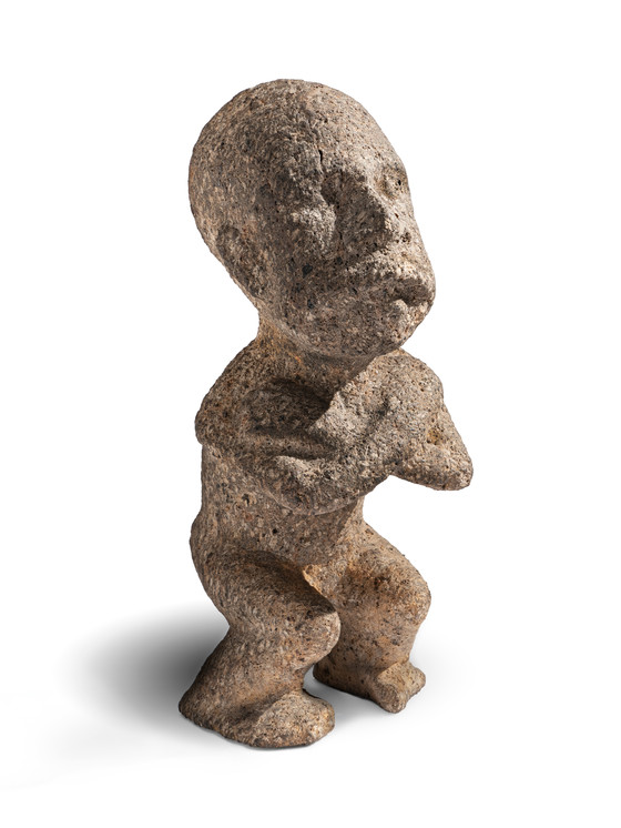 Squatting Hunchbacked Dwarf with Cranial Deformation and Arms Crossed in Supplication Pose