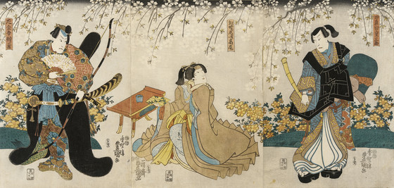 Actors in the Roles of Shimada Shigesaburō, Kugyō ama jitsuwa Takao and Sakingo Yorikane under Cherry Blossoms