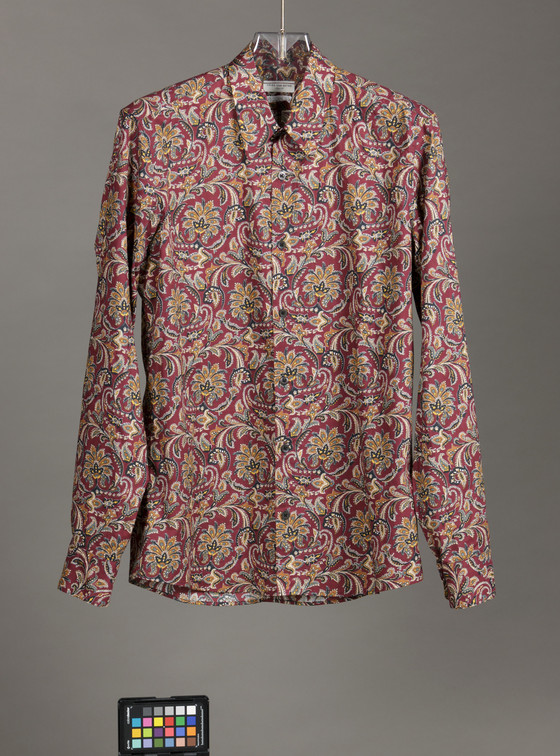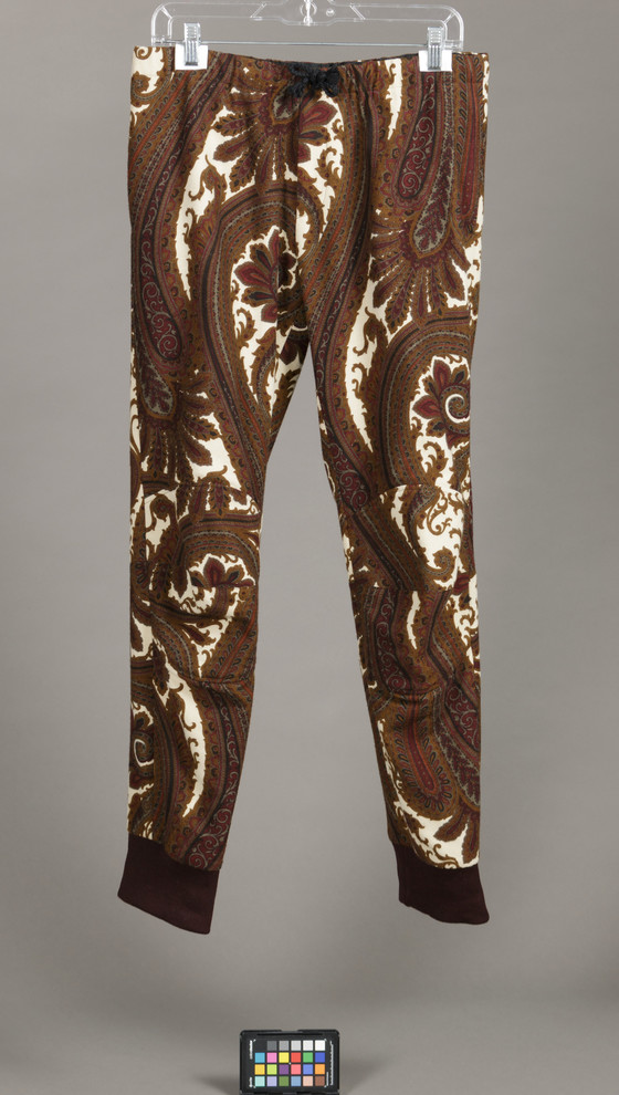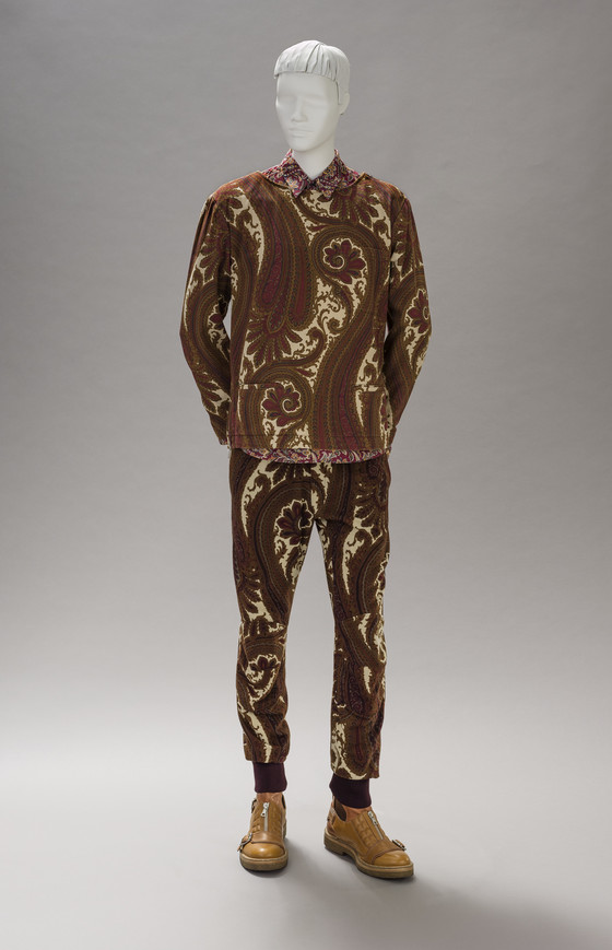 Tunic: cotton twill, printed; Shirt: cotton plain weave, printed; Trousers: wool plain weave, printed; Shoes: leather, metal, elastic, and rubber