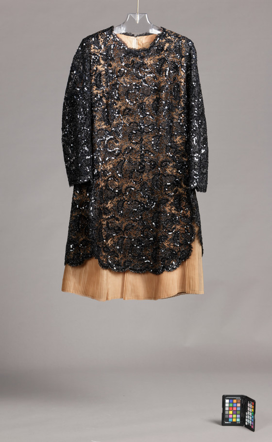 Silk plain weave (organza) and silk lace with sequins and metallic thread (tinsel) embroidery