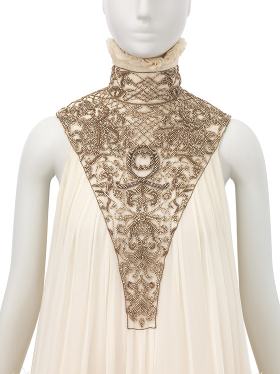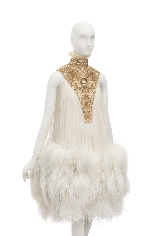Silk plain weave (chiffon) with feathers, silk net, glass beads, crystals, and metallic-thread braid