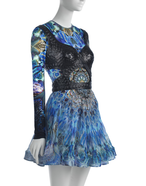 Silk/rayon/elastane knit and silk plain weave (chiffon), digitally printed, with nylon braid